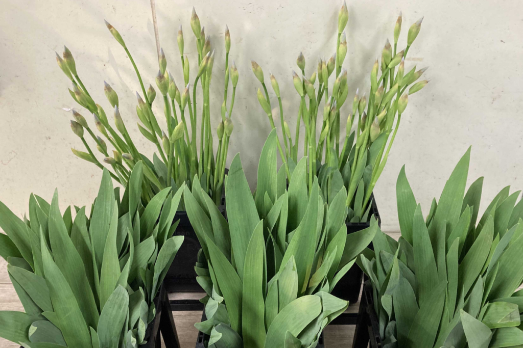 市場で出荷される規格は二花四葉(にかよんよう)【花2本、葉4組】ですが、今年からは小原流用に葉を1組加えた「二花五葉(にかごよう)」でお届けできるようになりました。市場経由では最小ロット30杯のところを、豊友会加盟店では10杯分から注文が可能。しかも生産地から店に直送予定なので、鮮度もかなり良くなります。