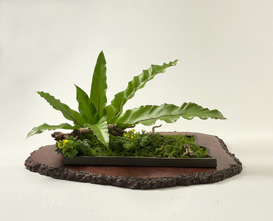 1929(昭和4)年に発行された、二世の時代の作品集『盛花瓶華集』からリメイクした写景盛花自然本位です。樹木に着生する谷渡りを株挿しでとらえ、熱帯に自生する植物の姿を表現しました。元となった作品では、谷渡りを株挿しし、水際を広く見せていますが、私はあえて水盤