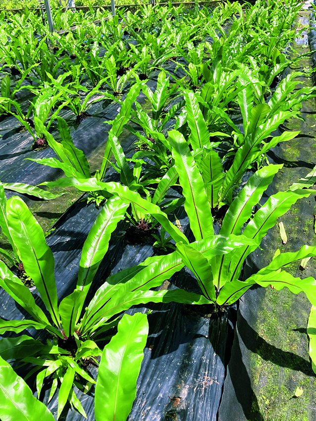 谷渡りは、国内では主に沖縄県で生産されますが、切り葉の価格低迷などから生産者が減少しています。豊友会の花店では、色彩盛花様式本位の一株挿しに応じて葉を選別し、皆さまへお届けしています。いけばな花材を守るプロジェクトは、これからも生産が続くように谷渡りの利用を推進していきます。